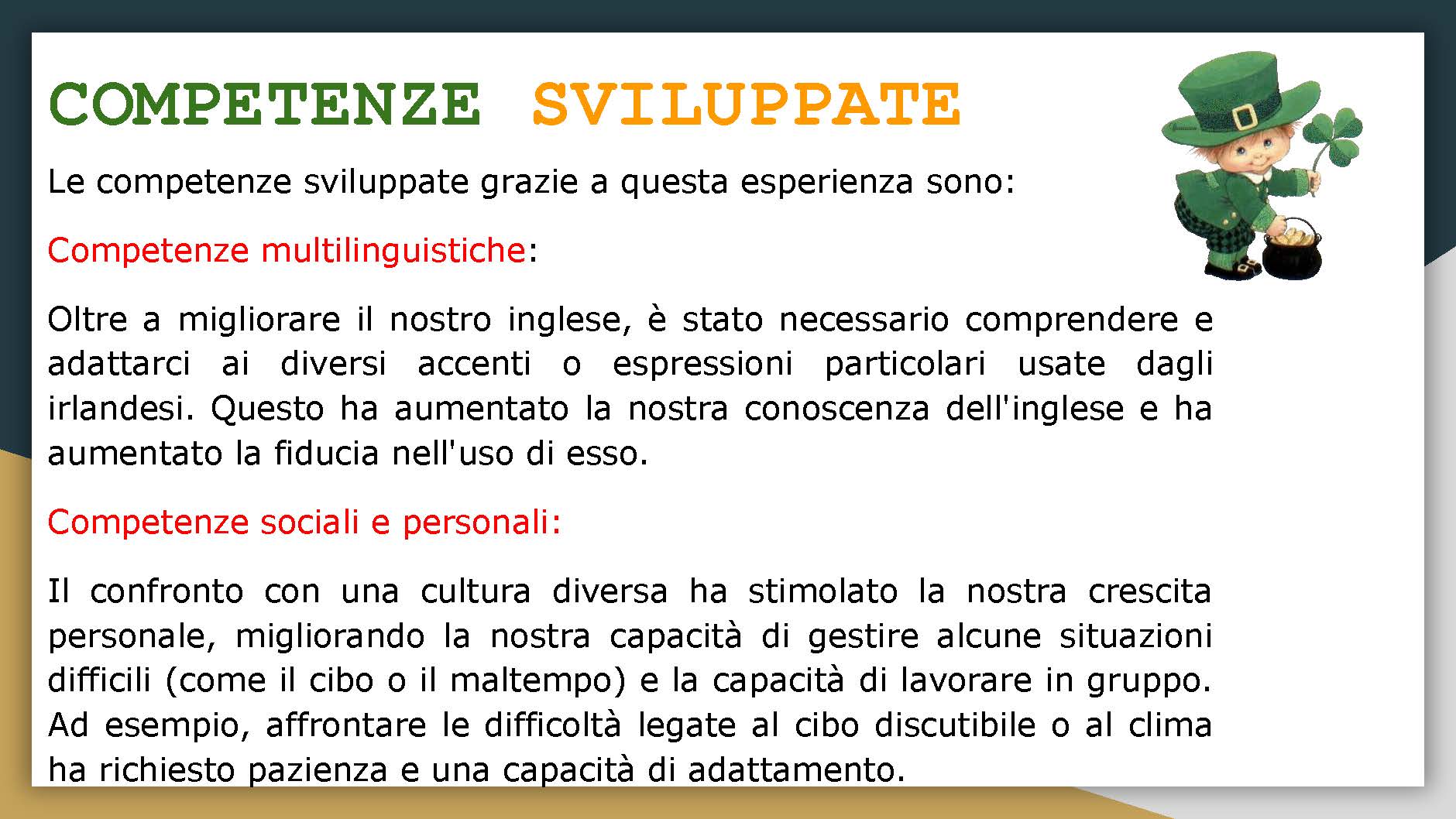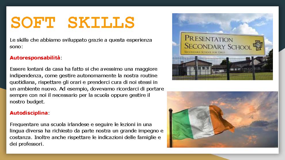Le studentesse a cui è stata proposta la mobilità di lungo termine in Irlanda ci hanno restituito un feedback positivo. Per ognuna di esse la mobilità Erasmus è stata una novità di esperienza, per la prima volta hanno potuto essere inserite nel contesto di una classe internazionale e conoscere un sistema educativo differente da quello italiano. La loro permanenza in Irlanda è stata fautrice d’incontro con una tradizione culturale che ha mosso la loro curiosità a tentare di approfondire sia la relazione con l’ambiente che con la storia dei luoghi. La familiarità con la lingua inglese, già ben studiata a scuola, le ha introdotte ad un uso più vivo della lingua e a seguire le discipline e le attività di classe in modo attivo. Nei loro report raccontano di aver imparato maggiormente a lavorare in team e di esser state gratificate di uscire dalla propria confort zone, come di essere riuscite a conquistare un’autonomia come persone più consapevoli dei piccoli traguardi da raggiungere.